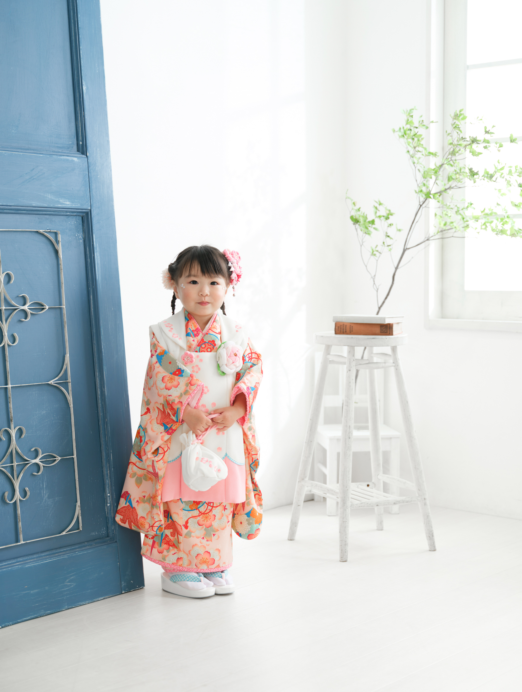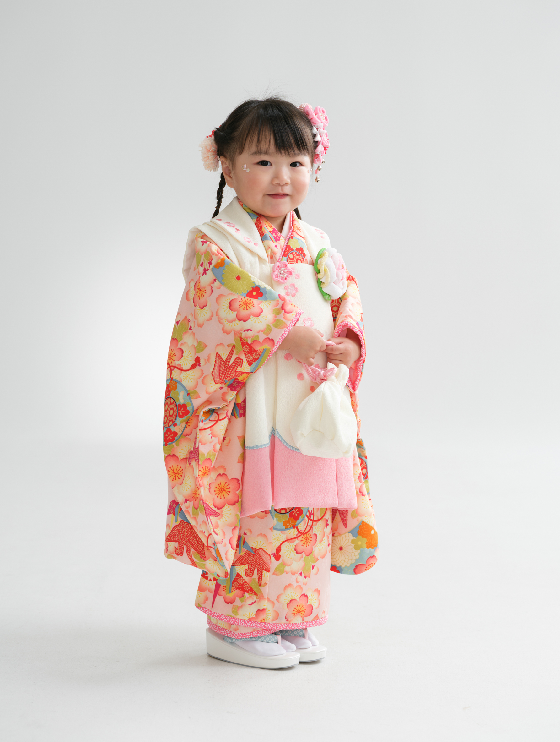 3歳の七五三は、被布スタイルが定番。動きやすく、可愛らしさを引き立ててくれます。 ピンクやクリーム、花柄などの柔らかい色合いは、幼さと上品さのバランスが抜群です。