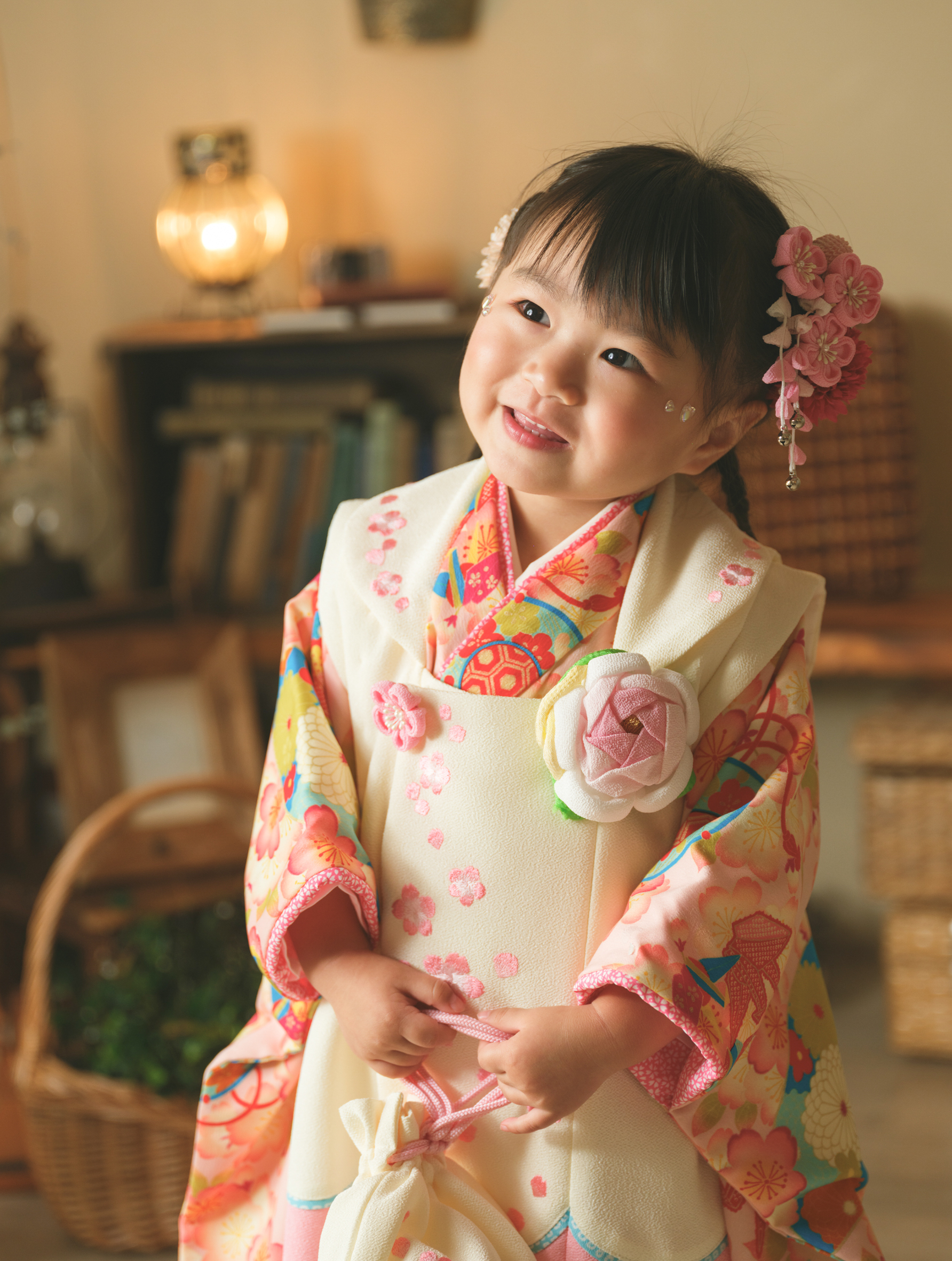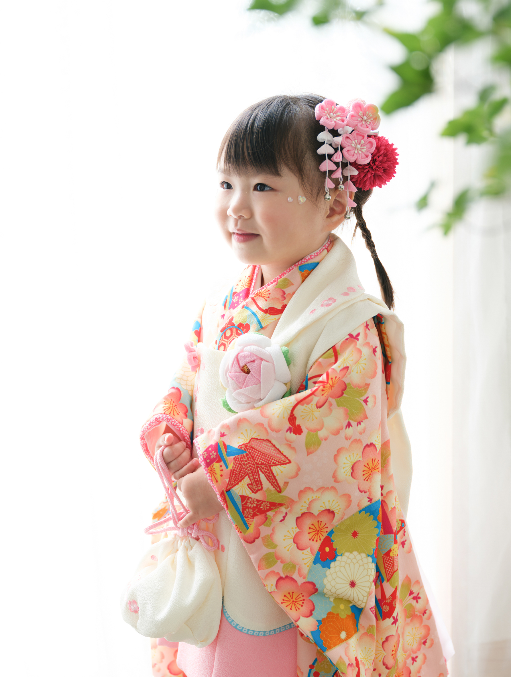 3歳の七五三は、女の子にとって“はじめてのお姉さん姿”。 小さな手で巾着をぎゅっと持ちながら、ちょこんと立つ姿がなんとも可愛らしい瞬間です。 淡いピンクの着物に、つまみ細工の髪飾りが華やかさを添えてくれました。